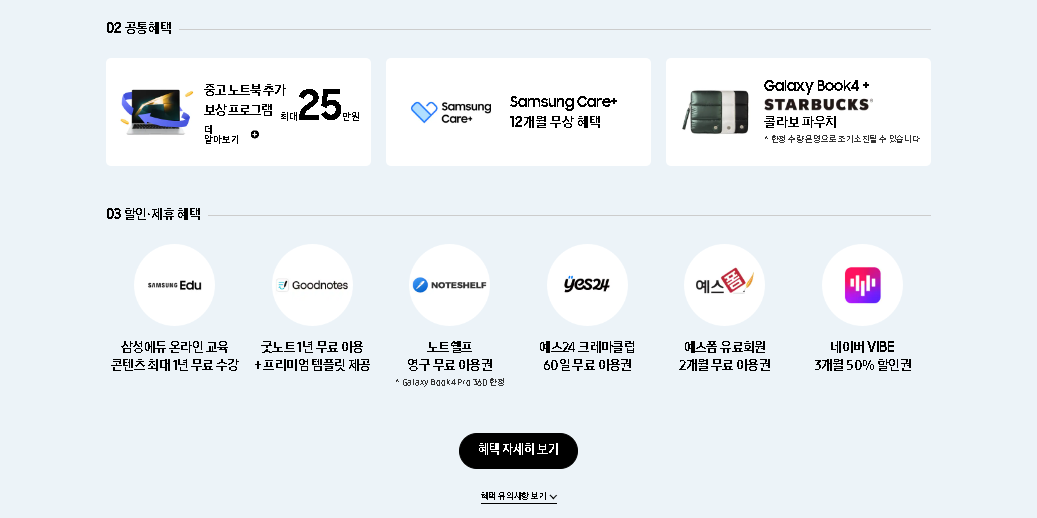 - 공통 혜택 : 중고 노트북보상(25만원), 삼성 Care+12개월 무상, 파우치 증정